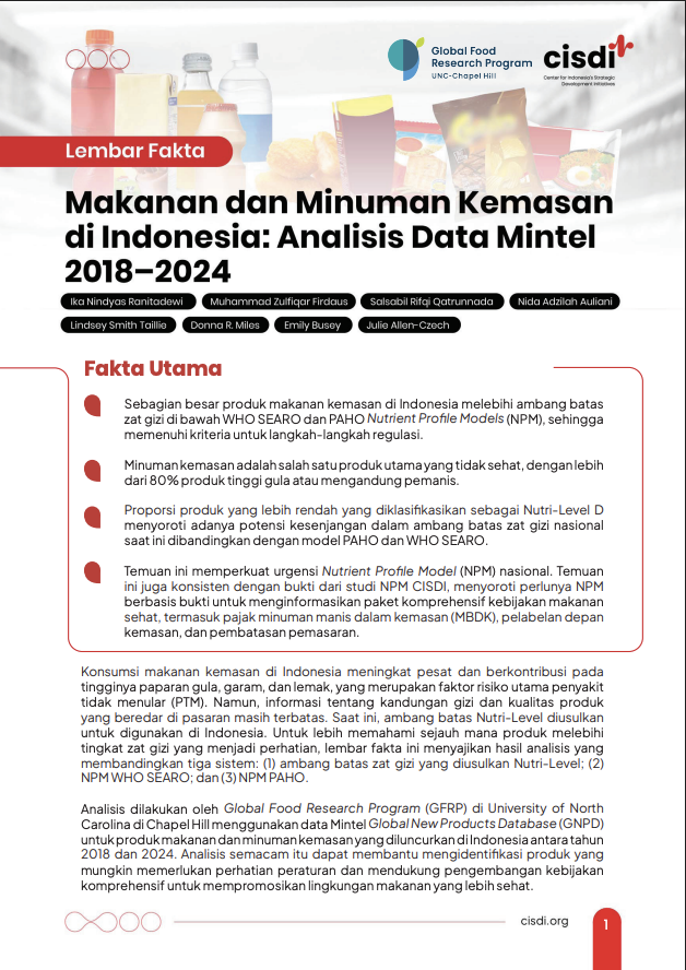 Dokumen ini merupakan lembar fakta (factsheet) yang menyajikan analisis mengenai kualitas gizi produk makanan dan minuman kemasan di Indonesia menggunakan pendekatan Nutrient Profile Model (NPM). Publikasi ini membandingkan tiga sistem klasifikasi zat gizi, yaitu Nutri-Level yang diusulkan di Indonesia, serta model dari WHO South-East Asia Region (WHO SEARO) dan Pan American Health Organization (PAHO), untuk menilai sejauh mana produk melebihi ambang batas gula, garam, dan lemak. Bekerjasama dengan Global Food Research Program (University of North Carolina at Chapel Hill), data Mintel Global New Products Database digunakan dalam analisis terhadap lebih dari 5.000 produk yang beredar di Indonesia pada periode 2018–2024. Temuan utama menunjukkan bahwa sebagian besar produk melebihi batas zat gizi menurut standar global, sementara sistem Nutri-Level saat ini cenderung kurang sensitif dalam mengidentifikasi produk tidak sehat. Dokumen ini bertujuan mendukung penguatan kebijakan pangan di Indonesia, dengan rekomendasi utama berupa adopsi NPM berbasis bukti yang selaras dengan praktik terbaik internasional, peninjauan ulang ambang batas Nutri-Level, perbaikan sistem pelabelan depan kemasan, serta penerapan kebijakan komprehensif untuk mengurangi konsumsi gula, garam, dan lemak.